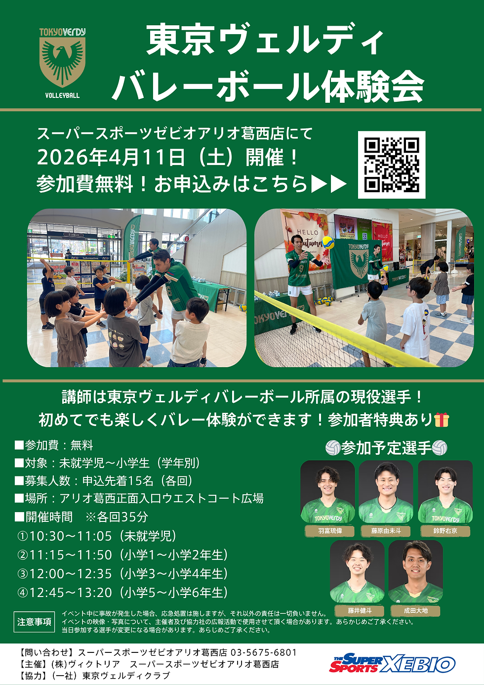 東京ヴェルディクラブ所属のバレーボールチームによる特別体験クリニックをアリオ葛西にて開催します!